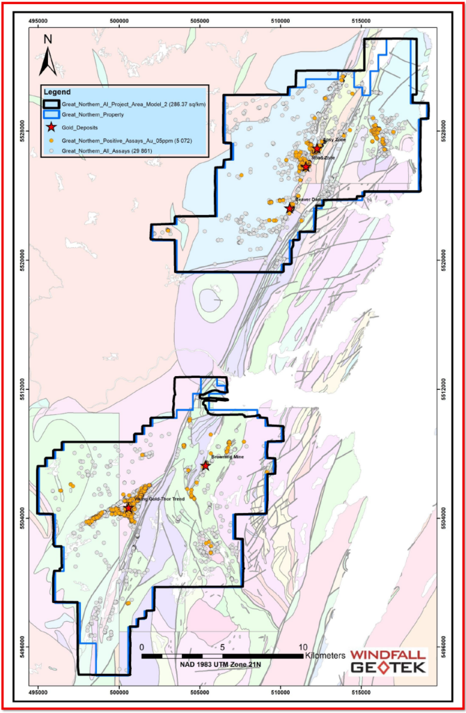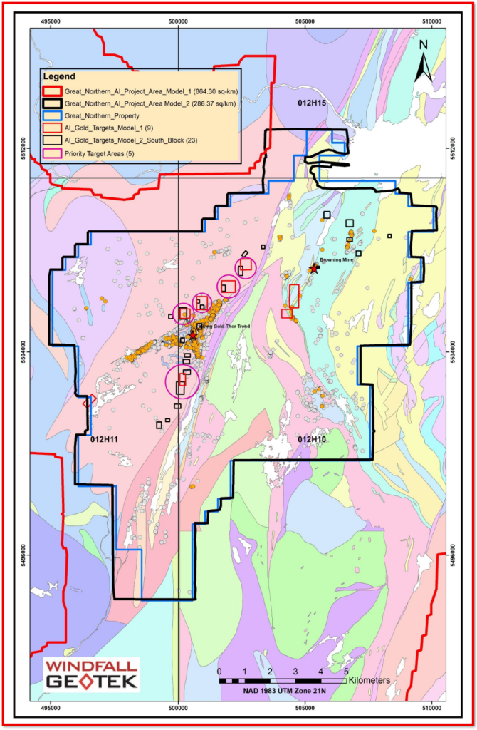 “At the junior stage, every drill hole matters. We view the Windfall Geotek AI-assisted targeting analysis as another useful layer in the process as we prepare for our inaugural drill program at Great Northern. By integrating geology, structure, geochemistry, geophysics, historical drilling and modern data analysis, the AI-generated targets will be reviewed alongside our VTEM™ survey results and structural interpretation as our technical team advances toward final drill collar selection. We are encouraged to see the results support known mineralized trends while also highlighting additional areas for evaluation across the district.”